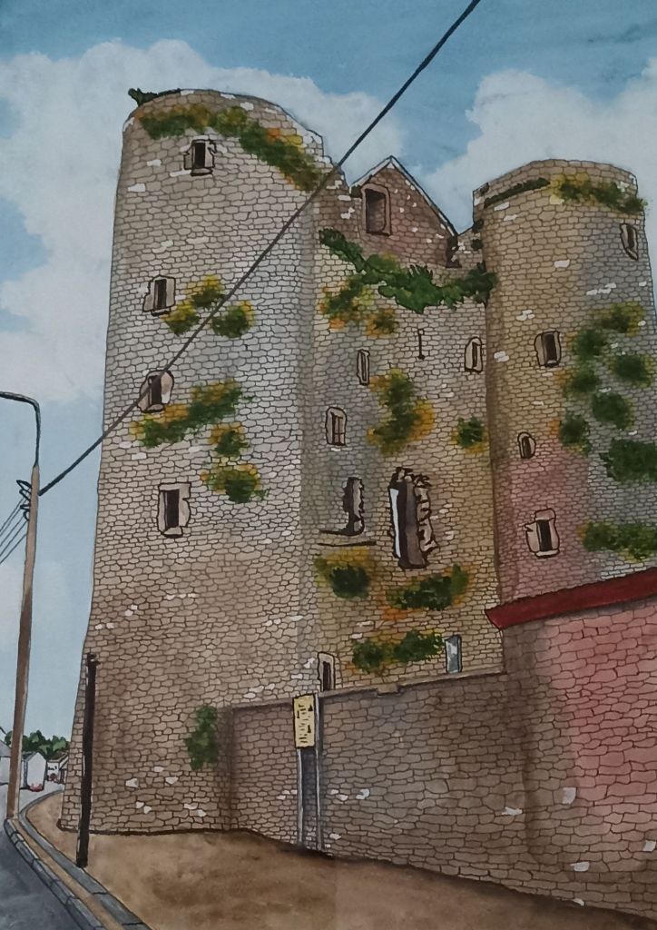 The castle was originally a grand structure, consisting of a central rectangular block flanked by five-story circular towers on each corner. Today, only the southern half of the castle remains, as the northern half and its towers were demolished long ago. Though now partially integrated into a private home and shop, its imposing ruins still serve as a reminder of its storied past.