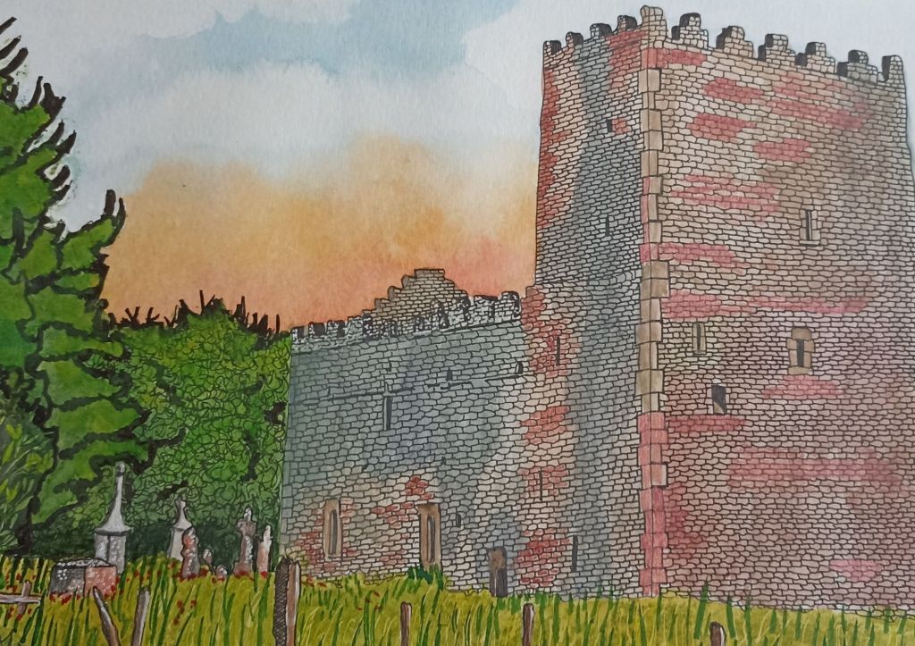 The church’s most striking feature is its four-storey western tower, which served as both a fortified residence and a sanctuary for clergy during turbulent times. The tower’s pronounced base batter and battlements with Irish crenellations add to its imposing presence. A machicolation above the south wall door highlights the defensive nature of the design.